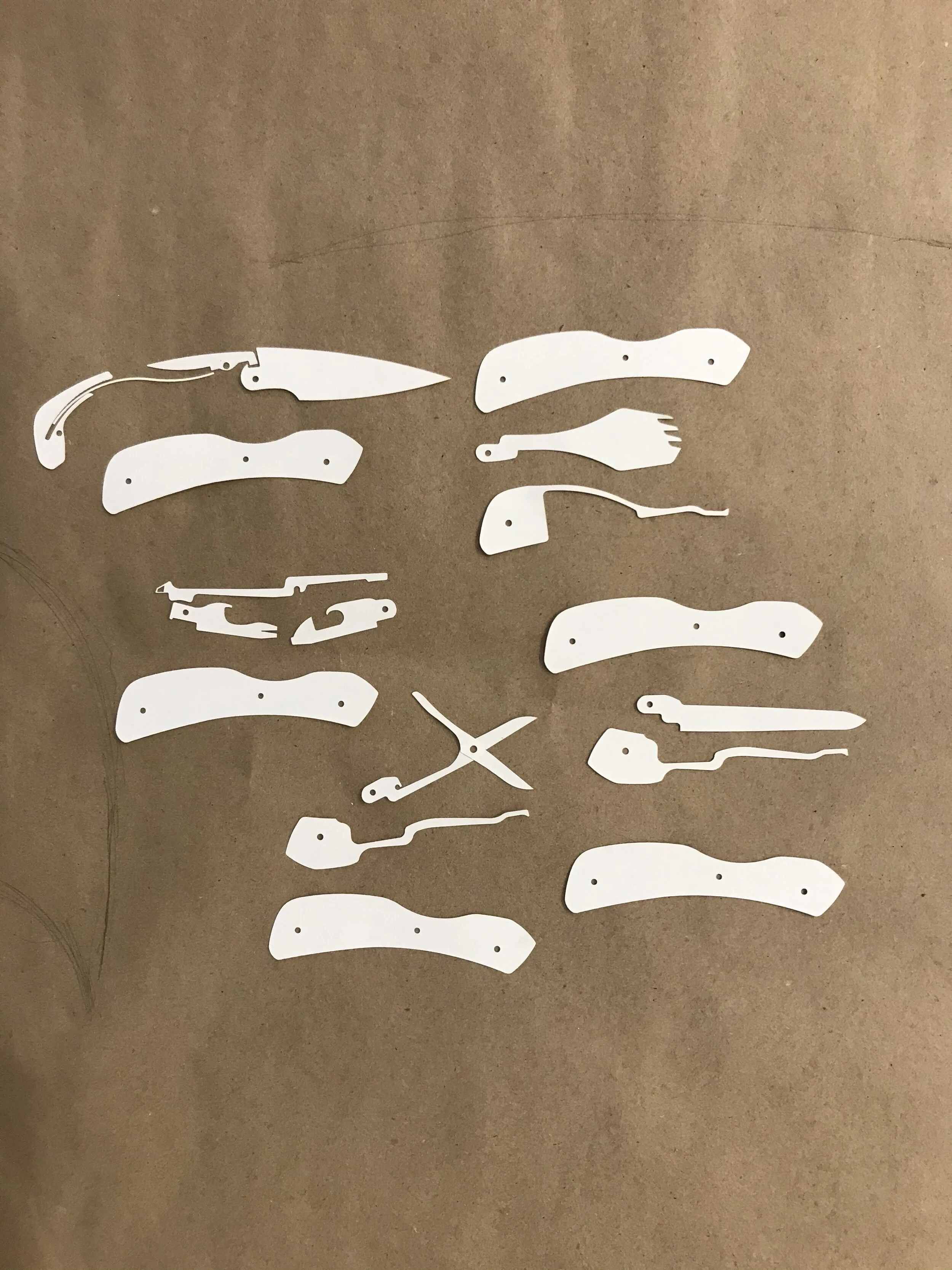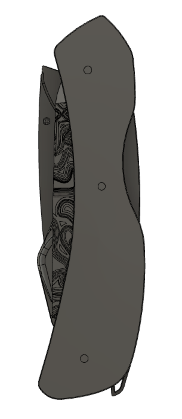 I used my initial concept sketch to create more refined linework in Fusion 360, that would enable accurate and rapid prototyping. With this linework, I laser-cut all of the components in construction paper to perform fit tests. This allowed me to make tweaks to the linework before moving into 3D modeling. My next step was to add volume to the vector art I had created using extrude, loft, and sweep functions. Now that all of the components had volume, I 3D-printed a second prototype from drafting resin to perform final fit-testing before sending my files off to Shapeways for binder jetting. These final components needed many hours of refinement, as the finish that was left by the binder-jetting process was very rough and inconsistent. This involved Dremel work, hand sanding, and polishing in order to achieve a brushed-metal finish. Finally, I cut and shaped the walnut scales with a table saw and a Dremel, and assembled the knife with epoxy and stainless steel pins.